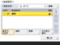 I ファクスの転送条件や<ナンバーディスプレイ設定>を<ON>にしているときは、選択項目が一部変わります。 I ファクスの転送先にWebDAV サーバーは設定できません。 <送信前に確認画面を表示>を有効にした宛先を転送先として指定したときは、パスワードを入力する画面は表示されません。登録したパスワードを使用して、そのまま転送されます。宛先を登録する 転送エラーになった文書は<転送エラージョブの処理>の設定にしたがって処理されます。 転送設定は、最大1000件まで登録できます。 |