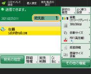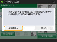 指定した宛先の総数を確認するには画面右上に、指定した宛先の総数が表示されます。送信前に宛先の数に誤りがないか確認することができます。 発信元の情報を付けて送信するには送信元の名前やIファクスアドレスなどを付けて送信することができます。 <発信元記録>送信状況を確認するには<状況確認>画面で送信状況を確認できます。状況を確認したうえで、もう一度送信しなおしたり、送信を中止したりすることができます。 送受信状況や履歴を確認する<ジョブ受付時の確認表示>が<ON>に設定されている場合は、送信ジョブが受け付けられたあとに表示される以下の画面から、<状況確認>画面を表示させることができます。 <ジョブ受付時の確認表示>送信結果のレポートをプリントするにはスキャンの基本画面で<その他の機能>  <送信結果レポート>を押すと、送信結果が記載されたレポートが自動的にプリントされるように設定できます。 <その他の機能>からジョブごとに設定するためには、 <送信結果レポート>で<エラー時のみ>または<OFF>を選択し、<「その他の機能」 でのプリントを許可>を<ON>にする必要があります。 安全にファイルを送信するには送信画像の写真が黒くつぶれてしまうときや、カラー原稿の下地の薄い色を除去できないときは以下の条件/設定を満たす場合は、送信画像の品位を改善できることがあります。 ジョブ種別: ファクス(メモリー送信)またはスキャンして送信(ファクス/Iファクス) <カラー選択>: <白黒2値>(スキャンして送信時) <原稿の種類>: <文字> <濃度>  <背景調整>: <自動> <解像度>: 200 dpi x 400 dpi 、300 dpi x 300 dpi*、400 dpi x 400 dpi 、600 dpi x 600 dpi* *はスキャンして送信で設定可能 |