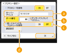 <プロキシーを使用>で<ON>を押し、必要な設定をしたあと、<OK>を押す