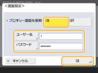 プロキシーサーバーの認証機能を使用するときに押して認証情報を設定します。表示される画面で<ON>を押し、プロキシー認証で使用するユーザー名とパスワードを入力したあと、<OK>を押します。