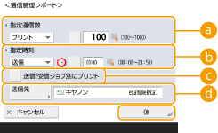 <管理設定>の<ジョブ履歴の表示>が<OFF>に設定されている場合、通信管理レポートの設定はできません。また、<管理設定>の<ジョブ履歴の表示>を<OFF>から<ON>に変更すると、通信管理レポートの<指定通信数>と<指定時刻>の設定が自動的に<OFF>になります。<ジョブ履歴の表示> |