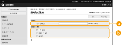 トナーの交換や紙づまりの処理などが必要になった場合に、あらかじめ指定したメールアドレスに通知することができます。