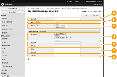 鍵とCSRを本機で生成します。CSRのデータは画面に表示されるほか、ファイルに出力することもできます。