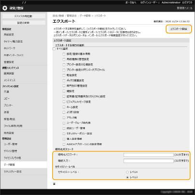 特定の項目ごとにエクスポートすることも可能です。設定/登録の各設定が、リモートUIからの一括エクスポートのどの項目に属するかは設定/登録を参照してください。