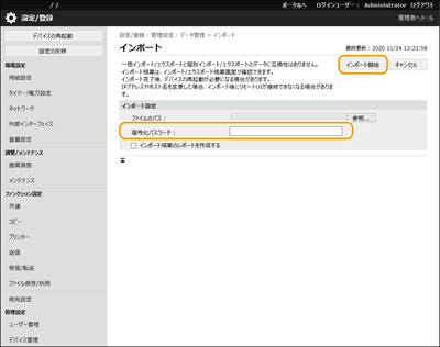 [復号化パスワード]には、設定データをエクスポートした際に入力した暗号化パスワードを入力します。