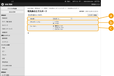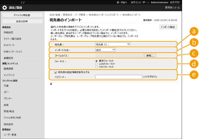 アドレス帳の宛先表やプリンター設定など、必要な設定内容だけを選んでインポート/エクスポートすることができます。Administratorの権限が必要です。