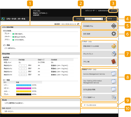 管理者としてログインしたときのみ表示される項目や、使用できる機能があります。 複数のユーザーが同時にリモートUIを操作しているとき、または本機の操作パネルとリモートUIを同時に操作しているときは、最後に行った操作が有効になります。 |