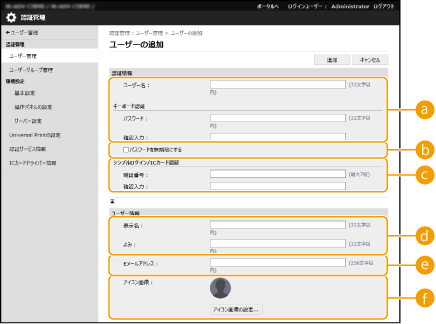 操作パネルから設定するユーザー情報は、  (設定/登録)  <管理設定>  <ユーザー管理>  <認証管理>  <認証ユーザーの登録/編集>からも登録できます。 <認証ユーザーの登録/編集>ユーザーグループを作成するユーザーを「ユーザーグループ」に登録することにより、アドレス帳の宛先表を登録ユーザー間で共有することができます( ユーザーグループを登録する)。 |