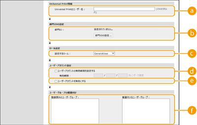 [Universal Printのユーザー名 :][設定/登録]
