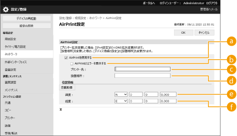 管理者権限でログインするとAirPrint専用ページからも、AirPrint設定を変更することができます。