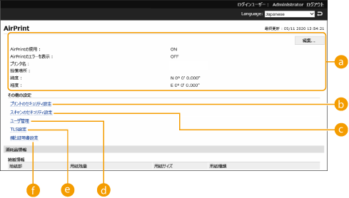 AirPrint専用ページからAirPrintの設定画面を表示したり、用紙やトナーなどの消耗品の状態を確認したりすることができます。また、セキュリティー機能の設定も行うことができます。