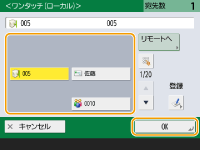 スキャン後に<ワンタッチ>画面から宛先を選択する場合は、<デフォルト画面の変更>で<ワンタッチ>を設定します。同じ宛先にスキャンする場合、設定する手間を減らすことができます。<デフォルト画面の変更> クライアント機に表示されるサーバー機のワンタッチ宛先は、以下のタイミングで最新の状態に更新されます。 クライアント機からの送信ジョブが完了したとき クライアント機で (リセット)を押したときクライアント機でオートクリア機能が作動したとき |