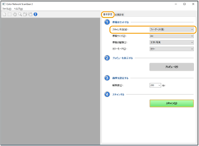 [基本設定]タブの[スキャン方法]で、原稿をセットした場所を選ぶ