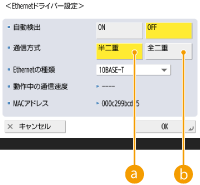 通常は<自動検出>で<ON>を選びます。Ethernetの通信方式や種類が検出されて自動的に設定されます。