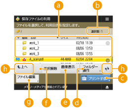 保存されているファイルやフォルダーファイルやフォルダーの選択状態、ファイルの種類やフォルダーを示すアイコン、名称、ファイルサイズ、保存した日付/時刻が表示されます。