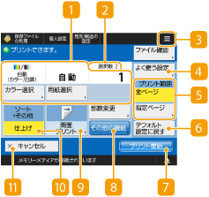 部門別ID管理で制限面数を設定している場合は、カウント残数を表示します。部門別ID管理と制限面数については、 部門別ID管理を開始するを参照してください。 異なるファイル形式(PDFとJPEGなど)を同時に選択した場合、以下の機能のみ設定/変更できます。 カラー 用紙選択 両面プリント 部数変更 |
