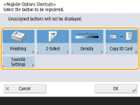 The number of setting items located on the Basic Features screen and the location to be displayed differ depending on functions. A shortcut button is not displayed if <Unassigned> is set as a shortcut. The limit to the number of shortcuts for <Options> you can register is as follows. Copy: 5 Fax: 4 Scan and Send: 2 |