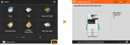 When the drum unit is nearing the end of its lifetime, a message prompting you to replace the drum unit is displayed at the bottom of the screen. Press the icon at the right bottom of the screen, and follow the on-screen instructions to replace the drum unit.