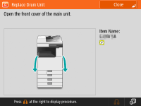 The drum unit replacement message displayed at the bottom of the screen differs depending on your contract. Press <Close> when you are finished with drum unit replacement. |