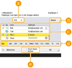 2 | Wählen Sie die in einer Gruppe zu registrierenden Ziele aus, und drücken Sie <OK>. ![]() Dropdown-Liste mit EmpfängertypenWählen Sie (E-Mail), (Fax), (I-Fax) oder (Datei), um die in der Adressliste ( ) angezeigten Empfänger zu filtern. Drücken Sie <Alle>, um alle registrierten Ziele anzuzeigen. <Details/Bearbeiten>Wählen Sie ein Ziel, und drücken Sie <Details/Bearbeiten>, wenn Sie die Einstellungen des Ziels prüfen möchten. Drücken Sie <OK>, um zum vorherigen Bildschirm zurückzukehren. EmpfängerlisteZiele, die in der in Schritt 6 gewählten Adressliste registriert sind, werden angezeigt. Wählen Sie in dieser Liste die Ziele aus, die Sie in einer Gruppe registrieren möchten. ![]() Wenn Ziele anhand von Zugangsnummern verwaltet werden, werden sie nur dann in der Liste angezeigt, wenn Sie die Zugangsnummer (Einschränken des Zugriffs auf im Adressbuch registrierte Empfänger) eingeben, nachdem Sie <Zugangs nummer> gedrückt haben. Schaltfläche für ersten BuchstabenWählen Sie die alphanumerische Schaltfläche für das erste Zeichen des Zielnamens. Drücken Sie <Alle>, um alle registrierten Ziele anzuzeigen. <Durch Name suchen>Geben Sie den Zielnamen ein. Drücken Sie erneut <Durch Name suchen>, um zum vorherigen Bildschirm zurückzukehren. |