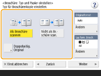 Drücken Sie <Ändern> unter <Originalformat>, und wählen Sie das Originalformat. Wenn Sie <Auto> wählen, wird das Broschürenformat automatisch entsprechend des Originalformats eingestellt.