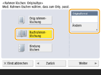 1 | Drücken Sie <Buchrahmen löschung>, und prüfen Sie <Originalformat>. ![]() Wenn das in <Originalformat> angezeigte Format vom Format des Buches abweicht, drücken Sie <Ändern>, um das Format zu wählen. Nur die auf dem Touchpanel-Display angezeigten Originalgrößen können gescannt werden. |