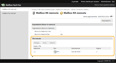 ![]() | È possibile utilizzare la IU remota per stampare, inviare o eliminare i fax e I-fax che sono momentaneamente memorizzati nella mailbox Fax/I-Fax. |