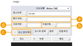 1 | 데이터를 전송하는 파일 서버/고급 박스의 호스트 이름을 입력합니다. ![]() 파일 서버/고급 박스에 대한 정보는 네트워크 관리자에게 문의하십시오. <프로토콜><Windows (SMB)>, <FTP> 및 <WebDAV>에서 파일 서버를 위한 프로토콜을 선택합니다. 문서를 고급 박스로 송신할 때 <Windows (SMB)> 또는 <WebDAV>를 선택합니다. ![]() <Windows (SMB)>을 선택하면, <호스트 검색> 및 <참조> 버튼이 표시됩니다. 네트워크를 검색하거나 확인하여 파일 서버/고급 박스를 쉽게 지정할 수 있습니다. <SMB 클라이언트 버전 지정>에서 <1.0>이 <설정>으로 설정된 경우 <참조>만 사용할 수 있습니다. <참조>에서 사용되는 디렉토리 서버를 최대 5대까지 등록할 수 있습니다. <호스트명>파일 서버/고급 박스의 호스트 이름을 입력합니다. 프로토콜로 <FTP>를 선택한 경우 <호스트명>을 다음과 같이 입력하십시오. TLS가 비활성화되어 있는 경우 예: 공유 스페이스에 저장: ftp://<호스트명>/share 개인 스페이스에 저장: ftp://<호스트명>/users TLS가 활성화되어 있는 경우 예: 공유 스페이스에 저장: ftps://<호스트명>/share 개인 스페이스에 저장: ftps://<호스트명>/users 문서를 고급 박스로 송신할 때 다음과 같이 <호스트명>을 입력합니다. 프로토콜에 <Windows (SMB)>을 선택한 경우 예: 공유 공간에 저장: \\192.168.100.50\share 개인 공간에 저장: \\192.168.100.50\users 프로토콜로 <WebDAV>를 선택한 경우 <호스트명>을 다음과 같이 입력하십시오, <다음>을 누릅니다. TLS가 비활성화되어 있는 경우 예: 공유 공간에 저장: http://<IP 주소 또는 호스트 이름>/ 개인 공간에 저장: http://<IP 주소 또는 호스트 이름>/ TLS가 활성화되어 있는 경우 예: 공유 공간에 저장: https://<IP 주소 또는 호스트 이름>/ 개인 공간에 저장: https://<IP 주소 또는 호스트 이름>/ <연결 확인>파일 서버/고급 박스와의 연결을 확인하려면 호스트 이름을 입력한 후 이 버튼을 누릅니다. ![]() 개인 인증 관리 등의 로그인 서비스를 사용하는 경우 <사용자명>과 <비밀번호>를 입력해야 합니다. |