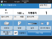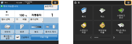 버튼 재배열 또는 단축키 생성과 같이 화면을 사용자 정의하려면 <홈> 화면과 기본 기능 화면에 표시된 을 누릅니다. 터치 패널 디스플레이 사용자 정의하기![]() 기기를 켠 직후 어떤 화면이 나타나며, 용지 및 토너 잔량에 대해 메시지가 나타나는지 여부와 같은 화면 디스플레이에 대한 설정을 변경할 수 있습니다. <표시 설정> 작동하지 않고 일정 시간이 경과했을 때 표시될 화면을 설정할 수 있습니다. <자동 리셋 후의 기능> |