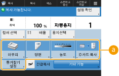 기본 특징 화면에 있는 설정 항목의 수와 표시될 위치는 기능에 따라 달라집니다. <할당없음>을 단축키로 설정하면 단축키 버튼이 표시되지 않습니다. 등록할 수 있는 <기타 기능>에 대한 단축키의 수는 다음과 같이 제한됩니다. 복사: 5 팩스: 4 스캔 및 전송: 2 |