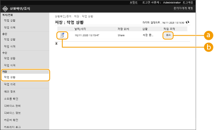 전송 대기중인 팩스 및 이메일, 수신된 팩스, 전송 대기중인 팩스의 상태를 확인할 수 있습니다. 문서 전송 및 수신 작업의 취소도 가능합니다.