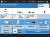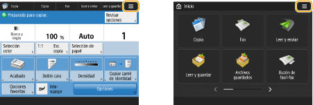 Pulse , que aparece en la pantalla <Inicio> y en la pantalla Funciones básicas, para personalizar la pantalla, reorganizando botones o creando una tecla de acceso directo. Personalizar la pantalla táctil![]() Puede cambiar las opciones de visualización en pantalla, como por ejemplo la pantalla que aparece justo después de encender el equipo, y si aparece el mensaje de papel y tóner restantes. <Opciones de visualización> Puede establecer qué pantalla debe mostrarse cuando haya transcurrido un tiempo sin que se realice ninguna operación. <Función tras reinicio automático> |