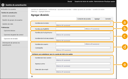 4 | Introduzca la información necesaria. ![]() [Nombre de dominio:]Introduzca el nombre de dominio del Active Directory que es el destino de inicio de sesión (Ejemplo: empresa.dominio.com). [Nombre de NetBIOS]Introduzca el nombre de dominio de NetBIOS (Ejemplo: empresa). [Nombre de host primario:] / [Nombre de host secundario]Introduzca el nombre de host del servidor Active Directory (Ejemplo: ad-server1). Si utiliza un servidor secundario, especifique el nombre en [Nombre de host secundario]. [Nombre de usuario:] / [Contraseña:]Introduzca el nombre de usuario y la contraseña para acceder al servidor Active Directory y buscar. [Nombre de inicio sesión:] / [Aparece como] / [Dirección de e-mail]Especifique los campos de datos (nombres de atributo) del nombre de inicio de sesión, el nombre visualizado y la dirección de correo electrónico de cada cuenta de usuario en el servidor Active Directory (Ejemplo: sAMNombreCuenta, cn, mail). |