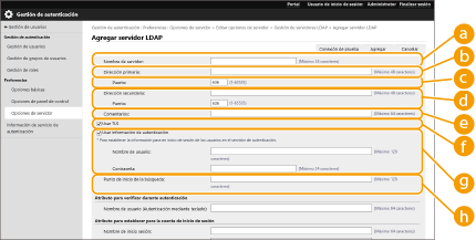 3 | Introduzca la información del servidor LDAP. ![]() [Nombre de servidor]Introduzca el nombre del servidor LDAP. El nombre "localhost" no se puede utilizar. El nombre del servidor no puede incluir espacios. [Dirección primaria]Introduzca la dirección IP o el nombre de host del servidor LDAP (Ejemplo: ldap.ejemplo.com). No se puede utilizar la dirección de bucle (127.0.0.1). [Puerto:]Introduzca el número de puerto empleado para comunicar con el servidor LDAP. Utilice la misma opción que está configurada en el servidor. Si no introduce ningún número, se configura automáticamente como "636" si está seleccionada la casilla de verificación de [Usar TLS] o como "389" si no se marca la casilla de verificación. [Dirección secundaria:] / [Puerto:]Si utiliza un servidor secundario en su entorno, introduzca una dirección IP y el número de puerto. [Comentarios]Introduzca una descripción o una nota según sea necesario. [Usar TLS]Marque la casilla de verificación al utilizar cifrado TLS para las comunicaciones con el servidor LDAP. [Usar información de autenticación]Quite la marca de la casilla de verificación para permitir el acceso anónimo al servidor LDAP, solo si el servidor LDAP está configurado para permitir el acceso anónimo. Si utiliza el nombre de usuario y la contraseña para autenticación, seleccione la casilla de verificación e introduzca valores de [Nombre de usuario:] y [Contraseña:]. [Punto de inicio de la búsqueda:]Especifique la ubicación (nivel) para buscar información de usuario al realizar la autenticación del servidor LDAP. |
