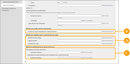 4 | Especifique cómo configurar los nombres de atributos y el nombre de dominio. ![]() [Nombre de usuario (Autenticación mediante teclado):]Especifique el campo de datos LDAP (nombre de atributo) del nombre de usuario en el servidor LDAP (Ejemplo: uid). [Nombre de inicio sesión:] / [Mostrar nombre] / [Dirección de e-mail]Especifique los campos de datos (nombres de atributo) del nombre de inicio de sesión, el nombre visualizado y la dirección de correo electrónico de cada cuenta de usuario en el servidor LDAP (Ejemplo: uid, cn, mail). [Especifique el nombre de dominio] / [Especifique el nombre de atributo para la adquisición del nombre de dominio]Seleccione cómo configurar el nombre de dominio del destino de inicio de sesión. Para especificar el nombre de dominio directamente, seleccione [Especifique el nombre de dominio] e introduzca el nombre de dominio. Para especificar un campo de datos LDAP (nombre de atributos) desde el que adquirir el nombre de dominio en el servidor LDAP, seleccione [Especifique el nombre de atributo para la adquisición del nombre de dominio] e introduzca el nombre de atributo (Ejemplo: dc). |