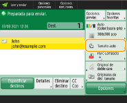 Comprobar el número total de destinos especificadosEn la parte superior derecha de la pantalla se muestra el número total de destinos especificados. Esto le permite confirmar antes de proceder al envío que el número de destinos es correcto. ![]() Para cancelar inmediatamente un trabajo que se está enviandoSi pulsa (Stop) en el panel de control mientras se está enviando un trabajo, aparecerá el mensaje <¿Desea cancelar el siguiente trabajo de envío?>. Pulse <Sí> para cancelar el envío.Puede seleccionar <Último trabajo recibido> o <Trabajo que se está enviando> seleccionar el trabajo que desea cancelar. <Trabajo que se cancelará al pulsar Detener> Pulse (Stop) cuando haya varios trabajos de envío que mostrar en la pantalla para seleccionar el trabajo de envío que desea cancelar. Si no se muestra el trabajo de envío que desea cancelar, pulse <Compruebe otros trab.> para mostrar <Trabajos de envío>. Seleccione el trabajo que desea cancelar y pulse <Cancelar>.Para consultar los estados de los documentos enviados/guardadosEn la pantalla <Monitor estado>, puede consultar los estados de los documentos enviados. En esta pantalla puede volver a enviar/guardar faxes o cancelar el envío/guardado tras consultar los estados. Comprobar el estado y el registro de los documentos escaneados Cuando <Mostrar notificación cuando se acepta el trabajo> está establecido en <Sí>, la pantalla <Monitor estado> puede mostrarse desde la siguiente pantalla mostrada tras la recepción de un trabajo enviado.<Mostrar notificación cuando se acepta el trabajo> ![]() Para imprimir el informe de los resultados del envío/guardadoEn la pantalla de Funciones básicas de lectura, al pulsar <Opciones> <Informe result. de TX> puede configurar que se imprima automáticamente el informe con la lista de resultados del envío/guardado.Para establecer esto para cada trabajo en <Opciones>, es necesario seleccionar <Sólo en caso de error> o <No> en <Informe result. de TX> y, a continuación, configurar <Permitir impresión desde opciones> en <Sí>. Nombre de archivoCuando se envía/guarda un archivo, el nombre de archivo se establece automáticamente según el formato siguiente. Puede cambiar la configuración para poder asignar un nombre. Configurar un nombre de archivo Al enviar por correo electrónico "Números de trabajo (cuatro dígitos)_números de página (tres dígitos).nombre de extensión de archivo", como "1042_001.jpg" Al guardar en un servidor de archivos "El año, mes, día, hora, minuto y segundo en que se guarda el archivo (14 dígitos).nombre de extensión de archivo", como "20151030133541.jpg" Asunto del correo electrónicoEl asunto introducido en <Asunto prefijado> se establece automáticamente (<Asunto prefijado>). Si especifica un asunto distinto, cambie la opción o especifíquelo cada vez que envíe un correo electrónico (Especificar las opciones de correo electrónico). |
