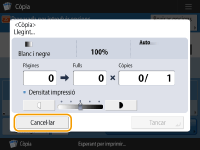 (Aturar) al tauler de control mentre es mostra la pantalla de funcions bàsiques de còpia, el treball de còpia queda en pausa i apareixen el missatge <AturarSeleccioneu el treball de còpia que voleu cancel·lar.> i la llista de treballs de còpia. Podeu seleccionar el treball de còpia de la llista i cancel·lar el treball prement <Cancel·lar>.Si inicieu la sessió amb la gestió d'autenticació personal i la tanqueu després de prémer