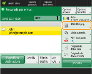 "L'any, mes, dia, hora, minut i segon en què s'hagi desat el fitxer (14 dígits).nom extensió fitxer", com ara "20151030133541.jpg" Assumpte del correu electrònicL'assumpte introduït a <Assumpte predeterminat> s'estableix automàticament (<Assumpte predeterminat>). Si especifiqueu un assumpte diferent, canvieu l'opció o especifiqueu-lo cada vegada que envieu un correu electrònic (Especificació d'opcions de correu electrònic).