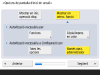 Seleccioneu quan s'ha de mostrar la pantalla d'inici de sessió. Si seleccioneu <Mostrar en selecc. funció>, premeu <Funcions> i <Còpia/impres. en color>, seleccioneu la funció per a la qual vulgueu mostrar la pantalla d'inici de sessió i premeu <Bé>. Seleccioneu també els elements de configuració de la pantalla <Configuració> per als quals vulgueu mostrar la pantalla d'inici de sessió.