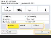 Na stroji můžete vyvolat předchozí používaná nastavení kopírování. Položky vyvolaného nastavení lze před kopírováním změnit.