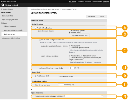 Chcete-li nastavit službu Active Directory nebo server LDAP jako další ověřovací zařízení, musíte uložit informace serveru používaného pro ověřování. Podle potřeby proveďte kontrolu připojení.