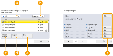 Når du gemmer indstillingerne for den brugerdefinerede papirtype, skal du huske at ændre dens navn. Du kan ikke ændre indstillingerne for standardpapirtyperne registreret i maskinen.