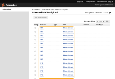 [Adresseliste for Administratorer] er kun tilgængelig for administratorer, der logger ind med administrator- eller enhedsadm-rettigheder.