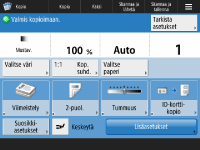 Voit muuttaa näyttöön liittyviä asetuksia, esim. mikä näyttö avautuu heti laitteen käynnistyttyä, ja näytetäänkö jäljellä olevaa paperin ja väriaineen määrää koskeva viesti. <Näyttöasetukset>