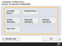<Kleurbalans> veranderen automatisch met de afbeeldingskwaliteit die u selecteert.Als u <Sepia kleur> selecteert, wordt <Enkelvoudige kleur (Sepia kleur)> weergegeven in <Selecteer kleur> op het scherm met basisfuncties voor kopiëren.