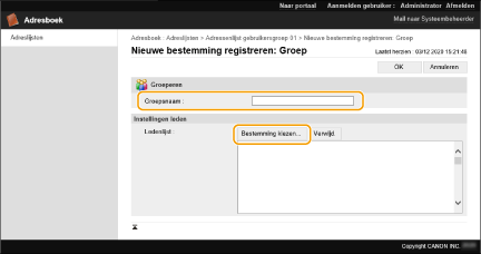 Voer een naam voor de groep in bij [Groepsnaam] en klik op [Bestemming kiezen] voor [Ledenlijst].