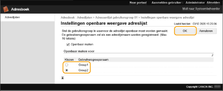 [Instellingen voor Persoonlijke adreslijst/Adressenlijst gebruikersgroep], en schakel het selectievakje [Gewijzigde naam voor gebruikersgroep op Adressenlijst gebruikersgroep toepassen] in. [Gewijzigde naam voor gebruikersgroep op Adressenlijst gebruikersgroep toepassen] is alleen beschikbaar wanneer persoonlijke-verificatiebeheer is ingeschakeld.