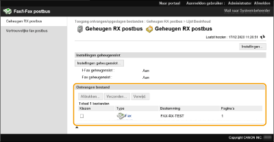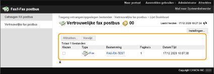 I-faxen die bij ontvangst zijn verdeeld, controlerenKlik op [Verdeelde geg. RX postbus] op het scherm dat bij stap 3 wordt weergegeven, om een lijst met I-faxen die bij ontvangst zijn verdeeld, weer te geven. I-faxen ontvangen