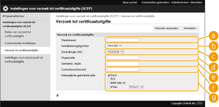 Een verzoek tot uitgifte van het certificaat dat nodig is voor sleutels die met de machine worden gegenereerd, kan worden verzonden naar een SCEP-server (Simple Certificate Enrollment Protocol) die certificaten beheert. Certificaten die vanaf de SCEP-server worden uitgegeven, worden automatisch op de machine geregistreerd. U kunt alleen een verzoek tot uitgifte van een certificaat verzenden als u Administrator-bevoegdheden hebt.