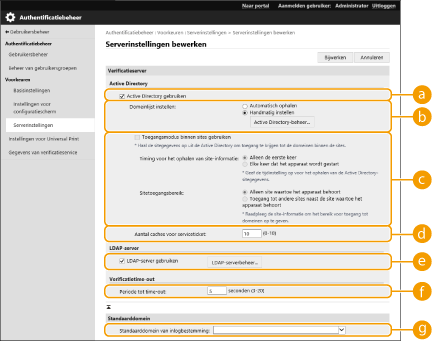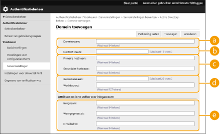 Selecteer hoe de domeinnaam van de aanmeldingsbestemming moet worden ingesteld. Als u de domeinnaam rechtstreeks wilt opgeven, selecteert u [Geef de domeinnaam op] en voert u de domeinnaam in. Om een LDAP-gegevensveld (attribuutnaam) op te geven waarvandaan de domeinnaam op de LDAP-server gehaald moet worden, selecteert u [Geef de attribuutnaam op voor het verwerven van domeinnamen] en voert u de attribuutnaam in (voorbeeld: dc).
